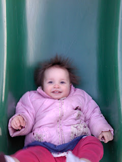 We went to the park for the first time this year and it was so funny, but everytime Maleena went down, her hair went up. She looked adorable with her hair standing on end. She brings a smile to all our faces!! We can't wait for many more slides and trips to the park.